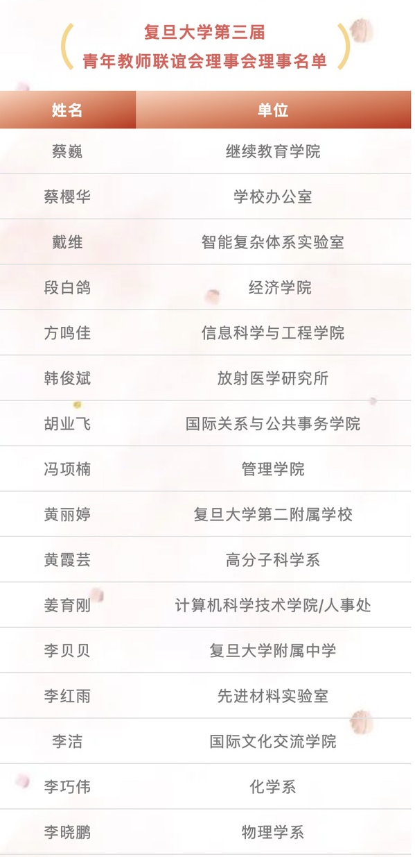 10月9日,复旦大学第三届青年教师联谊会理事会换届大会在线上顺利举行。校党委副书记、工会主席尹冬梅,校工会常务副主席王丽红,副主席金再勤、吴佳新、孙钢、奕丽萍出席会议,来自各院系各单位的青联会理事近40人参加了会议。会议由孙钢主持。