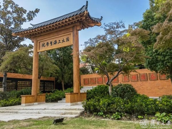 在福庆广场如茵绿草和清水红墙的映衬下,这座斗拱青瓦的木结构老校门显得古朴庄重。老校门正面门头牌匾镌刻着“国立上海医学院”字样,背面门头牌匾镌刻着“正谊明道”的上医院训。“为人群服务、为强国奋斗”的上医精神醒目地镶嵌背后红墙上,上医院歌的曲谱和歌词在左侧黑色大理石墙上熠熠生辉。老校门门头中心与校园内另一文化地标东一号楼中轴重合,体现出庄重感与仪式感。穿过老校门,背后是一行石阶,拾级而上,仿佛回到当年重庆歌乐山上。
