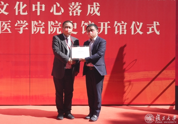 为了全面展现上医创建95年来的办学成果,传承上医精神血脉,弘扬优良传统,激励广大师生投身新时代、奋进新征程,上海医学院党委将已有60余年历史的西六号楼改建为上医文化中心,其主体为新的复旦大学上海医学院院史馆。上医文化中心的建设得到了复星集团等在内的社会各界的支持。复旦大学校长、上海医学院院长金力院士向上医文化中心项目捐赠方复星集团代表、复星国际联席CEO陈启宇颁发感谢状。