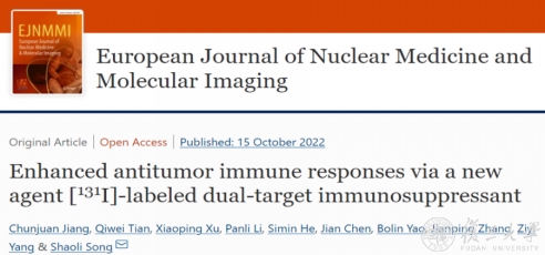 近日,复旦大学附属肿瘤医院核医学科主任宋少莉教授科研团队的最新成果“Enhanced Antitumor Immune Responses via a New Agent [131I]-labeled Dual-target Immunosuppressant”被核医学专业TOP期刊 European Journal of Nuclear Medicine and Molecular Imaging, EJNMMI接收。本研究创新性地探究了低剂量放射性核素131I增敏PD-L1/CTLA-4双靶向免疫抑制剂在抗肿瘤免疫应答中的价值。