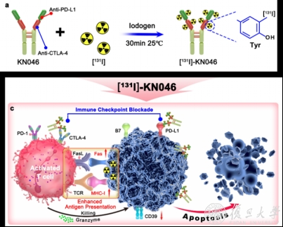 研究报道低剂量的电离辐射刺激可通过诱导肿瘤免疫原性相关抗原的释放用于免疫增强。131I是最常用的治疗型核素,其发生衰变后,能释放 99%的 β 射线和 1%的γ 射线。β 射线用于治疗,而 γ 射线用于 SPECT/CT 显像示踪。因此,我们利用131I和KN046构建了131I-KN046,结果显示131I-KN046对PD-L1/CTLA-4免疫双靶点具有高度的亲和力和特异性,能准确筛选出KN046抗体免疫治疗的受益亚群,且131I-KN046具有高的肿瘤滞留率,显示出显著的抗肿瘤效果。更重要的是,由于KN046的靶向性高,低剂量131I在肿瘤部位的富集能上调肿瘤微环境中免疫原性相关抗原的表达,增加了T细胞的活化程度和肿瘤内浸润性T细胞数量,从而显著提升了KN046的抗肿瘤疗效。