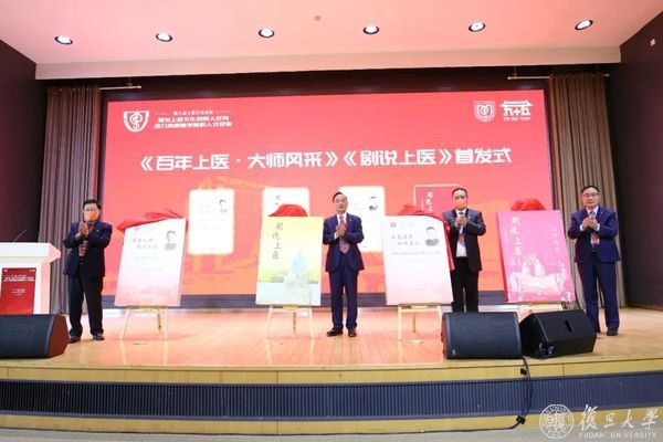 在大家的共同见证下,《百年上医·大师风采》和《剧说上医》系列丛书首发。金力、袁正宏、桂永浩,以及上医创始人颜福庆长孙、复旦大学放射医学研究所副研究员颜志渊为新书揭幕,复旦大学上海医学院党委副书记张艳萍主持新书首发仪式。