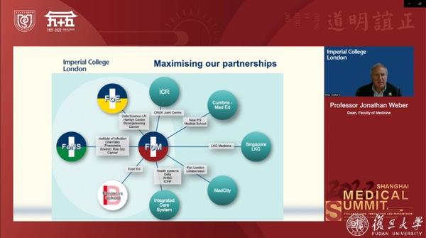 Jonathan Weber围绕主题“Innovation, Collaboration and Progression”介绍了英国帝国理工学院医学院的整体发展情况、创新孵化与发展、跨学科合作与临床转化的经验。特别分享了帝国理工是如何在基础研究到临床试验的过程中,通过多学科和机构间的合作克服障碍的有效经验。