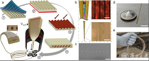 基于液膜在拉伸状态下的各向异性不稳定性,提出了一种在单次热拉过程中获得大规模间距可控的长纳米线的新型工艺。通过精心的沉积对纤维预制件进行模板化处理(图a),在热拉过程中液膜将预设的间距发生断裂形成纳米线(图b和c),实现规模化制备柔性准材料(图d和e)。