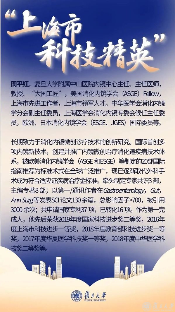 非常荣幸获评本届“上海市科技精英”,近20年我带领中山内镜团队创新开展的系列内镜微创诊疗新技术造福了更多病患,为中国内镜走向世界作出积极贡献。感谢科协对我工作的肯定;感谢复旦大学和中山医院的培养。未来我们将继续发扬“勤于观察、勤于思考、勤于行动、勤于总结”的中山内镜“四勤”精神,开拓进取,更具中国力量和中国特色的消化内镜创新诊疗平台,为国家医学中心建设和公立医院高质量发展建设贡献力量。