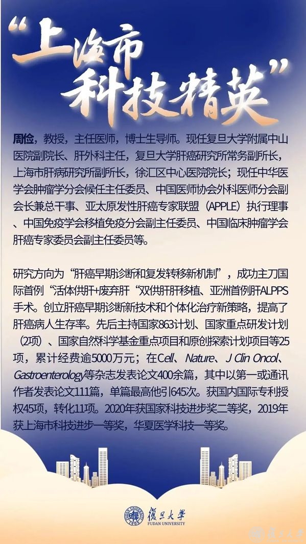 回望31年的肝癌研究生涯,在汤钊猷院士和樊嘉院士的指导下,在复旦大学和中山医院的支持下,我个人虽然取得了一点成绩,但肝癌研究还有很多痛点和难点亟待解决,如何进一步突破肝癌临床诊疗和基础研究的难题,仍然需要我们争分夺秒、只争朝夕地不懈努力奋斗。这次能够获得“上海市科技精英”的荣誉称号,既是对以往成绩的肯定,也是对未来努力的鞭策。我将不忘初心、一如既往,为提高肝癌病人生存率、为助力“健康中国2030”而不懈奋斗。