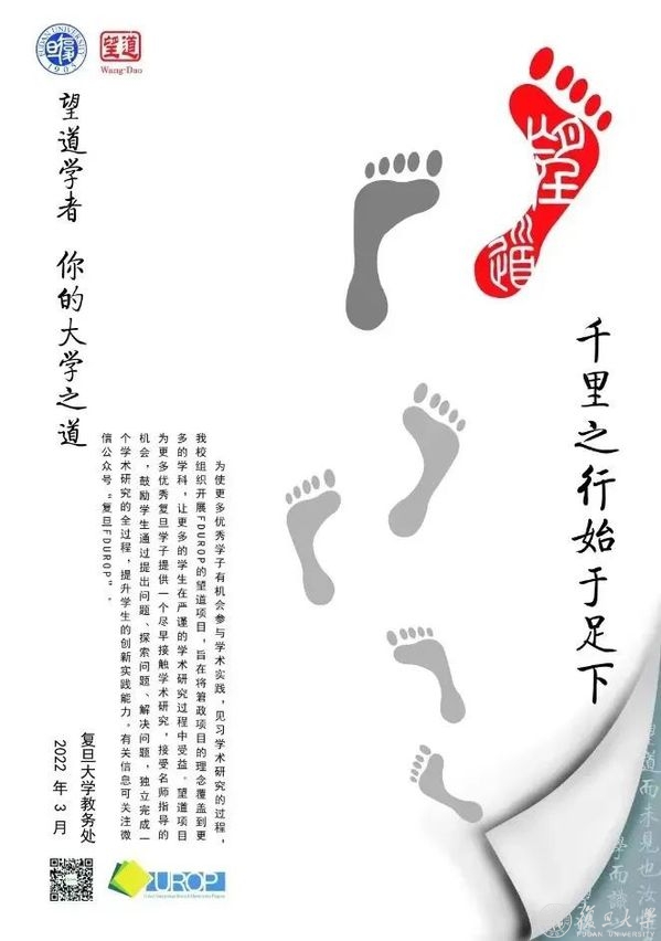 望道项目为优秀复旦学子提供一个尽早接触学术研究,接受名师指导的机会,鼓励学生通过提出问题、探索问题、解决问题,独立完成一个学术研究的全过程,提升学生的创新实践能力。参与“望道项目”并做出一定成绩的学生,将被授予“望道学者”称号。以“望道项目”为起点,众多“望道学者”已经在学术领域各有所成。“望道项目”也成为本科生参与科研的重要途径之一。