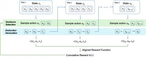 文章首次将强化学习方法引入蕴涵树生成任务,提出一种基于强化学习的蕴涵树生成框架,利用整个树的累积信号进行训练。它使用句子选择和结论生成两个模块迭代地执行单步推理,使用与评估方法一致的奖励函数进行训练信号的累积。