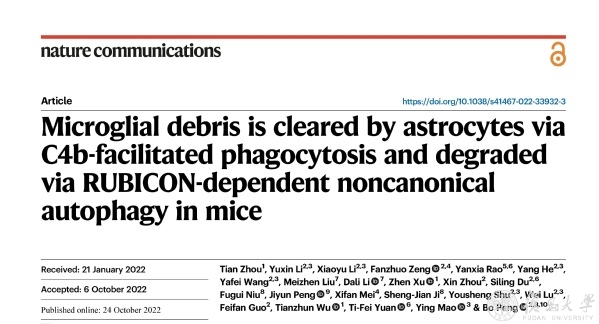 小胶质细胞是中枢神经系统(CNS)内重要的免疫细胞,在CNS发育、稳态维持和神经退行性病变等多个生理和病理进程中起关键作用。复旦大学脑科学转化研究院彭勃团队长期专注于小胶质细胞更替的研究。该团队前期系列研究工作阐明了小胶质细胞在更替过程中新生小胶质细胞的起源和迁移机制(Nature Neuroscience, 2018和Cell Discovery, 2018),并以此为基础开发了3种不同的小胶质细胞替换策略(Cell Reports, 2020),为神经系统疾病提供了新的治疗思路和可临床实现的方案。此外,该团队进一步发现NeuroD1可通过BCL2途径介导小胶质细胞凋亡,提出可利用该途径作为分子开关(switch-off control),增强小胶质细胞替换疗法的安全性(Neuron, 2021)。该团队在其前期研究的基础上,利用多种研究手段,进一步探究了小胶质细胞在更替过程中死亡细胞碎片的清除机制。该研究成果以Microglial debris is cleared by astrocytes via C4b-facilitated phagocytosis and degraded via RUBICON-dependent noncanonical autophagy in mice为题发表在Nature Communications上。