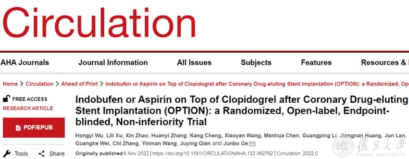 2022年11月6日,复旦大学葛均波团队在Circulation在线发表题为“Indobufen or Aspirin on Top of Clopidogrel after Coronary Drug-eluting Stent Implantation (OPTION): a Randomized, Open-label, Endpoint-blinded, Non-inferiority Trial”的研究论文,该研究发现在接受冠状动脉药物洗脱支架(DES)植入的中国心肌肌钙蛋白阴性患者中,吲哚布芬加氯吡格雷DAPT与阿司匹林加氯吡格雷DAPT相比,吲哚布芬加氯吡格雷DAPT显著降低了1年净临床结局的风险,这主要是由于出血事件减少而不增加缺血事件。