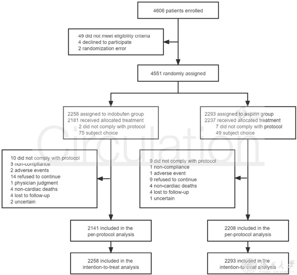 在这项随机、开放标签、非劣性试验中,接受冠状动脉药物洗脱支架(DES)植入的心肌肌钙蛋白阴性患者按1:1的比例被随机分配接受基于吲哚布芬的DAPT(吲哚布芬100mg每天2次+氯吡格雷75mg/d,持续12个月)或常规DAPT(阿司匹林100mg/d +氯吡格雷75mg/d,持续12个月)。主要终点为1年的心血管(CV)死亡、非致死性心肌梗死(MI)、缺血性卒中、确定或可能的支架血栓形成(ST)或出血学术研究协会(BARC)标准2、3或5型出血的综合研究。终点由一个独立的临床事件委员会裁决。