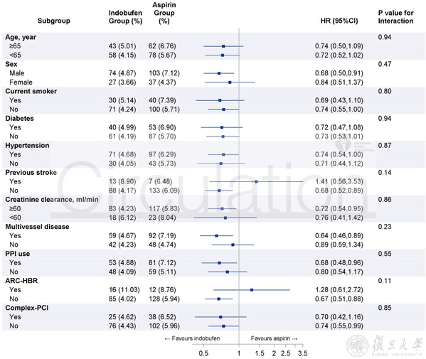 吲哚布芬DAPT组的CV死亡、非致死性MI、缺血性卒中和ST发生率分别为0.13%、0.40%、0.80%和0.22%,而常规DAPT组的发生率分别为0.17%、0.44%、0.83%和0.17%(均p>0.05)。与常规DAPT组相比,基于吲哚布芬的DAPT组BARC标准2、3、5型出血事件的发生率较低(2.97% vs 4.71%, HR 0.63, 95%CI 0.46 ~ 0.85, p=0.002), 2型出血的发生率降低(1.68% vs 3.49%, HR 0.48, 95%CI 0.33 ~ 0.70, p<0.001)。