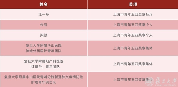 复旦上医共有3名青年荣获「上海市青年五四奖章」个人,其中1人获得标兵称号,3个集体荣获「上海市青年五四奖章」集体,名单如下。