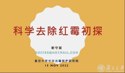 第三场报告会由中华古籍保护研究院特聘专家高智群教授主持。苏州博物馆姚瑶女史、甘肃文博服务中心张玉巧女史、上海视觉艺术学院陈纯、北京博晟文化遗产保护中心易吴尉,复旦大学文物保护创新研究院修复师徐强、纸质文物保护2020级专业硕士研究生王歌、中华古籍保护研究院青年副研究员谢守斌作报告。