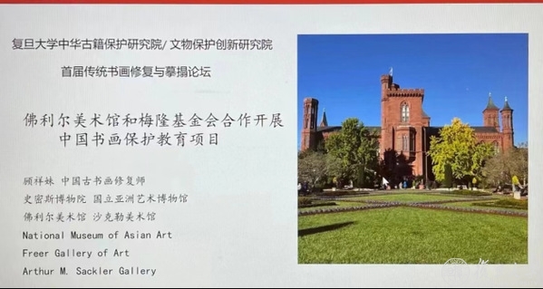 美国佛利尔美术馆顾祥妹女史、大英博物馆邱锦仙女史作大会主旨发言。顾祥妹女史对佛利尔美术馆和梅隆基金会合作开展的中国书画保护教育项目进行了介绍,该项目旨在为中国书画修复创建一个长期稳定可以进修学习交流的国际平台和良好的学习条件,为更多的年轻书画修复师提供学习机会、发挥才能。