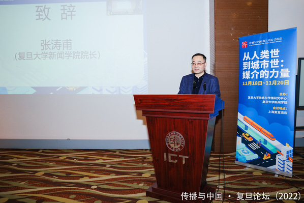 “从人类世到城市世:媒介的力量——传播与中国·复旦论坛(2022)”于11月18日至20日在上海举行。复旦大学新闻学院院长张涛甫教授与复旦大学文科科研处副处长罗长远教授出席开幕式并致辞,复旦大学信息与传播研究中心学术委员会副主席陆晔教授主持开幕式。传播与中国•复旦论坛是教育部人文社科重点研究基地复旦大学信息与传播研究中心与复旦大学新闻学院联合主办的一年一度全国性学术论坛,迄今已连续举办十六年,以高水准的学术研究和前沿性的议题,在海内外传播学界获得了很高的学术声誉。