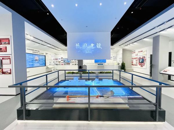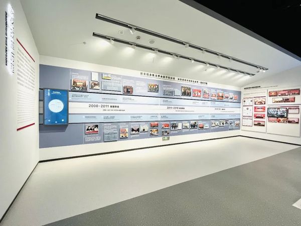 “奋进一流”展厅反映的是2000年两校合并、强强联合至今的发展历程,通过融入带有“复旦蓝”色调的浅蓝灰色为主色调,展现出科技感与未来感。展厅以“深化改革历程”为引领、以“发展成果巡礼”为主干,充分了展现了新世纪以来复旦上医走过了一条促进医教协同、深化改革之路,一条发挥综合性大学优势、交叉融合之路,一条紧跟现代医学发展趋势、创新突破之路,一条弘扬上医光荣传统、爱国奋斗之路。展厅中央放置的一个巨大沙盘,以声光电协同的形式展示了枫林校区全貌,象征着上医师生勠力同心,在建设中国特色世界一流医学院的新征程上阔步奋进。