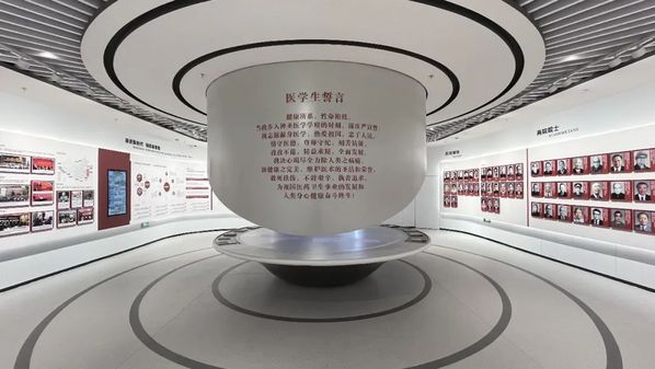 “新馆总面积约1600㎡,在之前老馆280㎡的基础上有了巨大的增量,这无疑对展陈内容和设计都提出了更高要求。”项目的设计方、上海市建筑装饰工程集团有限公司策划师、设计师说,“学校文案工作专班的老师在充分挖掘历史的基础上拓展资料,增加了许多动人的故事,我们根据这些资料和每个展厅的条件,选择了翻板、手绘、雕塑、互动电子屏等多种形式的展现手段。”与此同时,以文案为基础,设计方为每个展厅的展示重点都做了精心打磨:展现颜福庆老校长创办上医历程的全息影片,体现上医人“听党话、跟党走”的人物群雕,模拟外科手术台的人体解剖触摸屏,全方位展示新上医布局的电子沙盘,可呈现上医人祝福的球面互动屏……