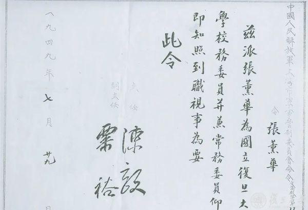 1949年7月29日,中国人民解放军上海市军管会主任陈毅、副主任粟裕签署的张薰华任复旦大学校务委员会委员兼常务委员的委任书