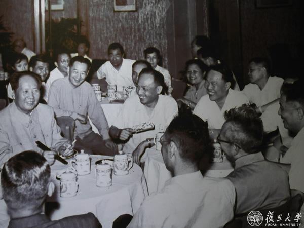 1958年,毛泽东主席在上海接见文教、卫生、艺术人士,复旦谈家桢、蒋学模、孙怀仁、章靳以等六位教授受到接见