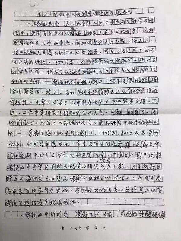 张薰华先生《关于中国城市土地制度课题的进展状况》手稿,级差地租理论研究直接催生了中国土地批租政策,并在 1988 年宪法修改中得到体现
