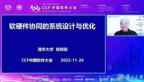 第二个特邀报告由南京航空航天大学黄志球教授主持。中国工程院郑纬民院士给大家带来了题为“软硬件协同的程序设计与优化”的大会报告。该报告针对当前复杂系统的硬件特征,提出了一系列软硬件协同的设计与优化方法,充分发挥底层的硬件算力。基于上述方法在新一代神威超级计算机上实现百万亿参数量预训练模型,百万亿边规模的通用高效图计算框架,以及针对当前闪存固态磁盘设计的高效存储系统软件。