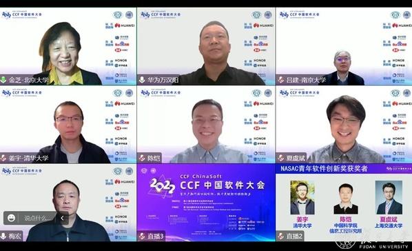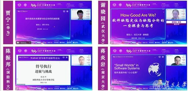 特邀报告之后的NASAC青年软件创新奖论坛包括1个企业青年软件创新人才报告和3位2021年度NASAC青年软件创新奖获奖人报告。第一个特邀报告由北京大学李戈教授主持。华为操作系统内核实验室副主任及内核架构首席专家贾宁博士以“操作系统未来展望与校企协同创新机制”为题,介绍了在未来面向计算架构、产业与应用场景等变化下,操作系统如何在计算系统中发挥中枢作用,如何承担释放芯片与硬件能力、使能应用高效运行、提升全局能效。报告讨论了操作系统演化的十种思考与挑战,并介绍了华为发起的 OpenEuler 与 OpenHarmony 开源操作系统社区,在软件生态、技术竞争力与商业落地方面获得一定的成果。除此之外还向大家介绍了华为与高校共建的创新及联合实验室、黄大年茶思屋开放平台、领域挑战难题揭榜、社区高校技术俱乐部等机制,以更高效的汇聚全社会力量共同打造中国基础软件的根。第二个报告同样由李戈教授主持。武汉大学谢晓园教授以“How Good Are We?软件缺陷定位与分析的一些探索与思考”为题,向大家报告了多年来在软件缺陷定位领域所做出的一系列理论与实践的研究成果。其中,利用基于频谱的缺陷定位与缺陷分离、缺陷报告的智能化理解等技术,实现一种高效的自动化缺陷定位技术,尽可能地减少人工操作,自动确定软件缺陷的位置或原因。这一技术可大幅度减轻程序员工作负担,提高调试的工作效率。第三个报告由南京大学卜磊教授主持。国防科技大学陈振邦副教授以“符号执行:进展与挑战”为题,向大家介绍了其团队近期在应对这两个挑战的相关成果和研究思考。陈振邦副教授首先介绍了符号执行的发展历程与路径爆炸和约束求解这两个基本挑战,然后从在平台积累和方法研究中提炼理论问题(基础理论)、面向通用性质或特定类型程序(分析验证方法)与不断提高工具能力扩展应用背景(工具)三个层面阐述了解决问题的思路。最后一个报告由国防科技大学董威教授主持。南京大学蒋炎岩副教授以“软件系统中的‘小小世界’”为题,向大家分享他在软件系统中寻找“小世界模型”并应用到软件质量保障的历程和感悟。软件工程自学科诞生起就在与飞速增长的软件复杂性赛跑,理论、方法和工具伴随也随着软件体量增长而茁壮成长,蒋炎岩副教授用三个小故事分别向大家介绍了他在测试输入生成问题、自动化软件动态更新与计算机教学三方面上的工作与反思。