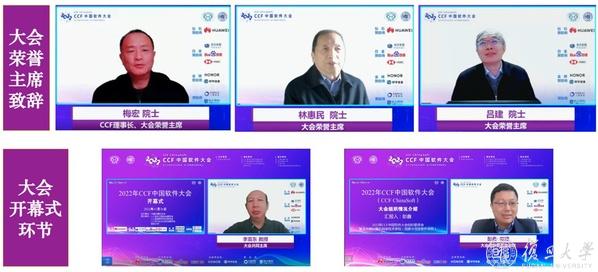 大会开幕式由大会共同主席、CCF软件工程专委会主任李宣东教授主持。中国计算机学会理事长、大会执行委员会荣誉主席、中国科学院院士梅宏,大会执行委员会荣誉主席、中国科学院院士林惠民,大会执行委员会荣誉主席、中国科学院院士吕建分别在线进行了开幕致辞;中国科学院院士和中国工程院院士陆汝钤、陈左宁、柴洪峰、廖湘科、王怀民分别发表了视频致辞。院士们回顾了中国软件事业的发展历程以及中国软件领域当前面临的挑战,分析了“软件定义一切”的新机遇,为中国软件事业发展进一步指明了方向,同时也对本次CCF中国软件大会的召开表示热烈祝贺。