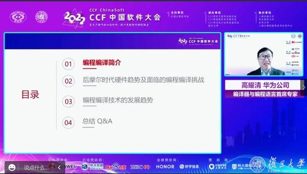 第五个特邀报告由南京大学王林章教授主持。华为公司编译器与编程语言实验室主任及首席专家高耀清博士给大家带来了题为“后摩尔时代编程编译技术的发展趋势”的大会报告。该报告分析了后摩尔时代通用芯片算力性能提升遇到的瓶颈和挑战,指出新兴场景如机器学习以及多样化算力异构计算等都使得编程语言和编译迎来了又一个创新发展的新机遇。报告中分享了近年来编程语言与编译技术方面的发展以及后摩尔时代面临的挑战和机遇,展望了未来的技术发展趋势。