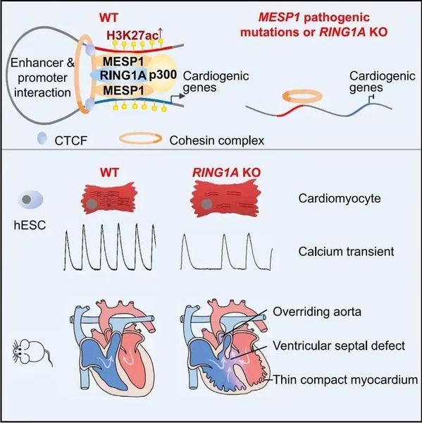 11月21日,复旦大学基础医学院孙宁实验室和复旦大学生物医学研究院(IBS)蓝斐实验室在Developmental Cell在线发表论文Essential role of MESP1-RING1A complex in cardiac differentiation,发现转录因子MESP1结合表观因子RING1A在心脏发育中共同发挥重要作用。本研究首次发现MESP1可与PRC1核心蛋白RING1A相互作用,协同结合并激活人类心脏早期发育相关基因表达。这些研究不仅证明了MESP1-RING1A在心脏发育中的重要性,同时也为MESP1,PRC1 和 cohesin组分突变导致先天性心脏病的机制提供了可能的解释。