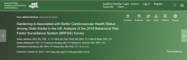 复旦大学公共卫生学院高翔教授与来自美国宾州州立大学医学院的团队近日在Journal of Academy of Nutrition and Dietetics上发表了题为“Gardening is Associated with Better Cardiovascular Health Status Among Older Adults in the US: Analysis of the 2019 Behavioral Risk Factor Surveillance System (BRFSS) Survey”的最新研究成果,研究了园艺活动可能带来的健康益处。经过对数据的整理统计分析,“园艺组”在研究关注的诸多健康问题方面完胜“不锻炼组”,“园艺组”即使在与“锻炼组”相比较时也能略胜一筹。园艺活动所展现出的诸多健康益处,可能是因为“园艺组”因为从事园艺活动而成功让自己“动”了起来,并在从事园艺活动的过程中亲近了自然,得到了身心愉悦的反馈,种出的果实还有助于提高自身的蔬菜水果摄入量。