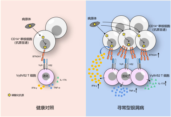 近日,复旦大学附属华山医院皮肤科张正华研究员团队联合上海市免疫学研究所沈蕾研究员团队在《美国科学院院报》刊登题为“Upregulation of BTN3A1 on CD14+ cells promotes Vγ9Vδ2 T cells activation in psoriasis”的研究成果,共同揭示调控银屑病患者γδT细胞活化的新机制。银屑病是一种常见的慢性炎症性自身免疫性疾病,可能会有多系统损害的累及。IL-23/Th17轴的免疫紊乱是其主要的驱动因素。虽然目前针对IL-17a单抗的生物制剂治疗给患者带来了全新的皮损获益,但是随着生物制剂使用时间的延长我们发现仍然有存在继发性失效的现象存在。除了Th17细胞之外,γδT细胞是IL-17的另一重要来源。研究发现Vγ9Vδ2 T细胞作为人外周血中主要的γδT细胞类型在寻常型银屑病患者中呈现过度活化状态,本文对其分子调控机制做出了全新的研究。