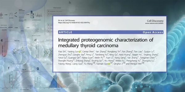 近日,复旦大学附属肿瘤医院头颈外科嵇庆海教授、王宇教授、魏文俊副主任医师领衔的研究团队与西湖大学郭天南教授团队合作,联合浙江省肿瘤医院、常州市第二人民医院、泰州市人民医院、北京大学深圳医院,成功绘制国际上首个甲状腺髓样癌蛋白基因组学全景图谱,研究结果在线发表于国际顶尖生物医学期刊Cell Discovery,并被选作当期亮点文章。本研究中,研究者对102位髓样癌患者的肿瘤/配对正常组织进行了基因全外显子组测序,并利用下游转录及蛋白组测序结果对基因突变性质进行联合解析,成功绘制出目前世界上最大的甲状腺髓样癌基因变异图谱,并为91%的髓样癌患者找到了非常明确的病因。更为重要的是,研究团队对102名髓样癌患者肿瘤组织的进行了深入蛋白组学质谱检测,并对其中绝大多数组织完成了转录组、甲基化组和磷酸蛋白质谱的测序。多组学联合分析表明,甲状腺髓样癌在蛋白表达谱上可以分成三类异质性明显的类型。这意味着甲状腺髓样癌更精准的治疗策略将有据可依。