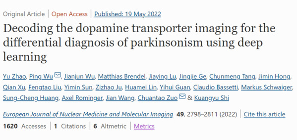 帕金森病(PD)是仅次于阿尔茨海默病的第二大神经退行性疾病,临床鉴别诊断困难。复旦大学附属华山医院核医学科/PET中心依托国家神经疾病医学中心综合性大平台的优势,长期致力于提升帕金森综合征的鉴别诊断。近期,团队先后在核医学专业顶级期刊Journal of Nuclear Medicine(《核医学杂志》)、European Journal of Nuclear Medicine and Molecular Imaging(《欧洲核医学与分子影像杂志》)和运动障碍性疾病领域顶级期刊Movement Disorders(《运动障碍》)发表文章,揭示了人工智能技术在帕金森综合征鉴别诊断中的价值,并逐步完善了基于脑代谢模式的帕金森综合征诊断与鉴别诊断体系。