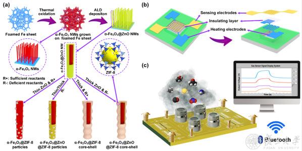 图1. (a) αFe2O3@ZnO@ZIF-8核壳异质纳米线的合成路线图;(b) MEMS器件结构图;(c) MEMS基气体传感系统搭建示意图