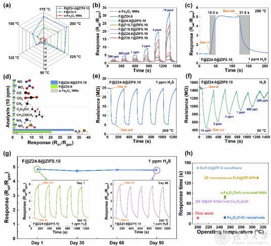 近日,复旦大学微电子学院卢红亮教授课题组首次结合热氧化工艺、原子层沉积(ALD)工艺和溶剂热工艺合成了金属有机框架(MOF)修饰的α-Fe2O3@ZnO@ZIF-8核壳异质纳米线材料,并以此制备了低功耗MEMS基硫化氢(H2S)气体传感器,对浓度低至200 ppb H2S实现了超灵敏和高选择性的探测。相关成果以“Heterostructured α-Fe2O3@ZnO@ZIF-8 Core–Shell Nanowires for a Highly Selective MEMS-Based ppb-Level H2S Gas Sensor System”为题发表在国际顶级期刊Small上。微电子学院卢红亮教授为本文通讯作者,博士研究生朱立远为第一作者。