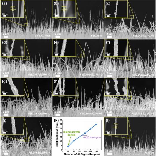 图2. 精心调控形貌、组分的α-Fe2O3@ZnO@ZIF-8异质纳米线的SEM表征结果和ALD生长速率分析图
