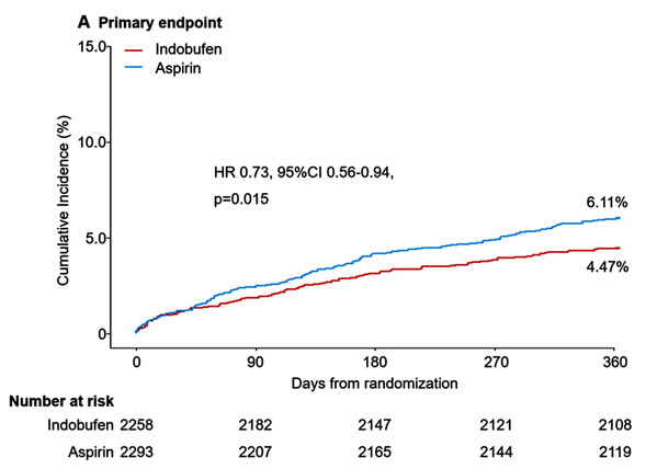 近日,附属中山医院葛均波院士团队在Circulation在线发表题为“Indobufen or Aspirin on Top of Clopidogrel after Coronary Drug-eluting Stent Implantation (OPTION): a Randomized, Open-label, Endpoint-blinded, Non-inferiority Trial”的研究论文,该研究发现在接受冠状动脉药物洗脱支架(DES)植入的中国心肌肌钙蛋白阴性患者中,吲哚布芬加氯吡格雷DAPT与阿司匹林加氯吡格雷DAPT相比,吲哚布芬加氯吡格雷DAPT显著降低了1年净临床结局的风险,这主要是由于出血事件减少而不增加缺血事件。