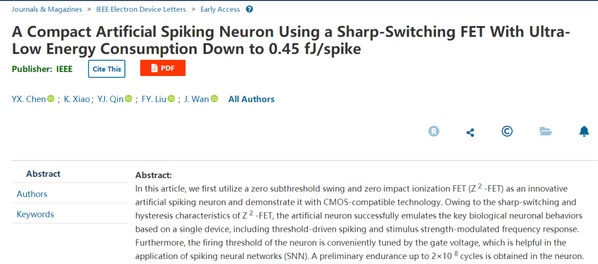 近日,信息科学与工程学院万景研究员课题组基于零亚阈摆幅零碰撞电离晶体管(Zero Subthreshold Swing and Zero Impact Ionization FET,Z2-FET),创新性地发明了一种与CMOS工艺兼容的人工脉冲神经元。该神经元仅仅使用单个晶体管,即可实现完整的IF功能与自复位,并能通过改变器件的栅压来调控神经元的脉冲发放阈值,展现了在高集成度和低功耗的脉冲神经网络中的应用潜力。该研究成果以“A Compact Artificial Spiking Neuron Using a Sharp-Switching FET With Ultra-Low Energy Consumption Down to 0.45 fJ/spike”为题发表于微电子器件领域旗舰期刊IEEE Electron Device Letters。