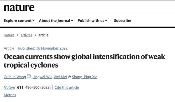 近日,大气与海洋科学系/大气科学研究院王桂华教授课题组与其合作者,提出用海表面漂流浮标(drifter)观测的高精度海洋混合层流速来估算台风强度。通过分析1991-2020年期间全球大量drifter观测的混合层流速数据发现,最近30年占全球70%的弱台风无论在全球尺度还是海盆尺度上都存在明显的增强趋势。相关成果以《海流显示全球弱台风显著增强》(Ocean currents show global intensification of weak tropical cyclones)为题,在线发表于《自然》(Nature)杂志。