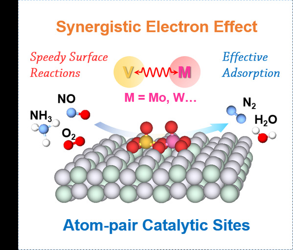 近日,环境科学与工程系唐幸福教授课题组设计并合成了一系列原子对催化剂,并优化了成对原子之间的电子协同效应。相关的研究成果以题为“An Atom-Pair Design Strategy for Optimizing the Synergistic Electron Effects of Catalytic Sites in NO Selective Reduction”的研究论文,发表于国际知名学术期刊Angewandte Chemie International Edition上。该工作首先成功制备了负载于锐钛矿型TiO2(001)表面上的V1-W1原子对活性位。透射电镜、高角环形暗场扫描透射电镜、X射线吸收光谱和原位拉曼光谱等表征技术证明了均一的V1-W1原子对的成功制备。