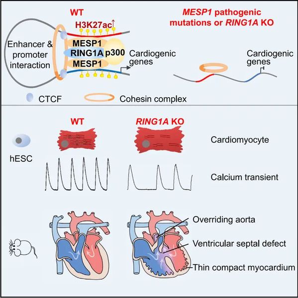 近日,基础医学院孙宁团队和生物医学研究院蓝斐团队在Developmental Cell上在线发表了题为Essential role of MESP1-RING1A complex in cardiac differentiation的工作。该研究发现,MESP1-RING1A可与cohesin复合体结合,通过调控染色质相互作用,激活心脏发育基因的表达。同时发现,MESP1致病突变会影响MESP1与RING1A及cohesin组分的结合,影响心脏发育基因的表达及心肌的正常分化。这些研究不仅证明了MESP1-RING1A在心脏发育中的重要性,同时也为MESP1, PRC1 和 cohesin组分突变导致先天性心脏病的机制提供了可能的解释。