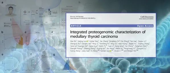 近日,附属肿瘤医院头颈外科嵇庆海教授、王宇教授、魏文俊副主任医师领衔的研究团队与西湖大学郭天南教授等团队合作,成功绘制国际上首个甲状腺髓样癌蛋白基因组学全景图谱,研究结果在线发表于国际顶尖生物医学期刊Cell Discovery,并被选作当期亮点文章(Featured article)。该研究不仅通过多组学联合分析的手段,发现了甲状腺髓样癌中新的致病基因,还首次提出了甲状腺髓样癌的三类分子分型,并指出了每种分子分型潜在的精准治疗方向。