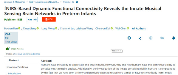 近日,信息科学与工程学院陈炜教授课题组在生物医学工程领域国际顶级期刊IEEE Transactions on Neural Systems and Rehabilitation Engineering上发表了题为“fNIRS-Based Dynamic Functional Connectivity Reveals the Innate Musical Sensing Brain Networks in Preterm Infants”的研究论文。该研究提出了一种基于功能性近红外光谱信号(fNIRS)动态功能连接的被试间成分分析法,提取了早产儿在接受相同音乐刺激时所呈现的被试间相关性最强的脑功能网络,得到了反映具有早产儿群体一致性的动态脑功能网络。