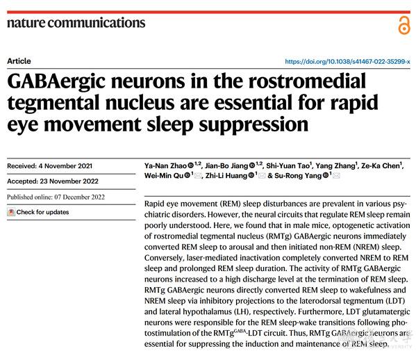 2022年12月7日,基础医学院药理学系黄志力团队杨素荣等在Nature Communications在线发表题为“GABAergic neurons in the rostromedial tegmental nucleus are essential for rapid eye movement sleep suppression”的研究论文,揭示了吻内侧被盖核(RMTg)GABA能神经元抑制REM睡眠启动和维持的重要机制,揭示该核团中止REM睡眠,实现向觉醒及NREM睡眠转换的神经环路。