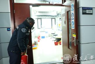 校保卫处安保人员在接到自动警报后,立即派出由4位安保人员组成的现场处置队伍奔赴事故现场,3分钟内已到达事故现场并从灭火器箱中拿取灭火器灭火(图13、图14),火情很快被扑灭;保卫处和高分子系领导接到报告后也同时到达事故现场,在组织人员疏散的同时,分别派人逐层检查各楼层人员是否疏散完毕,搜索可能进入到卫生间的疏散人员,并立即向校职能部门上报事故情况。