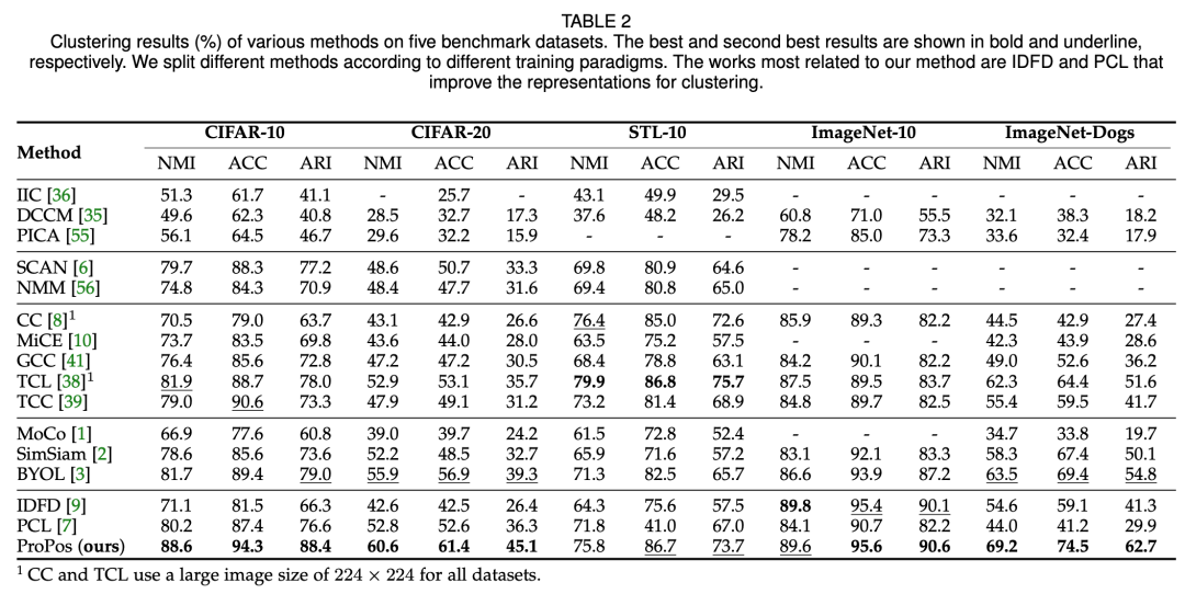 图5:性能对比,我们提供了 ProPos 在多个深度聚类的基准数据集上的性能对比,ProPos 取得了非常大的提升