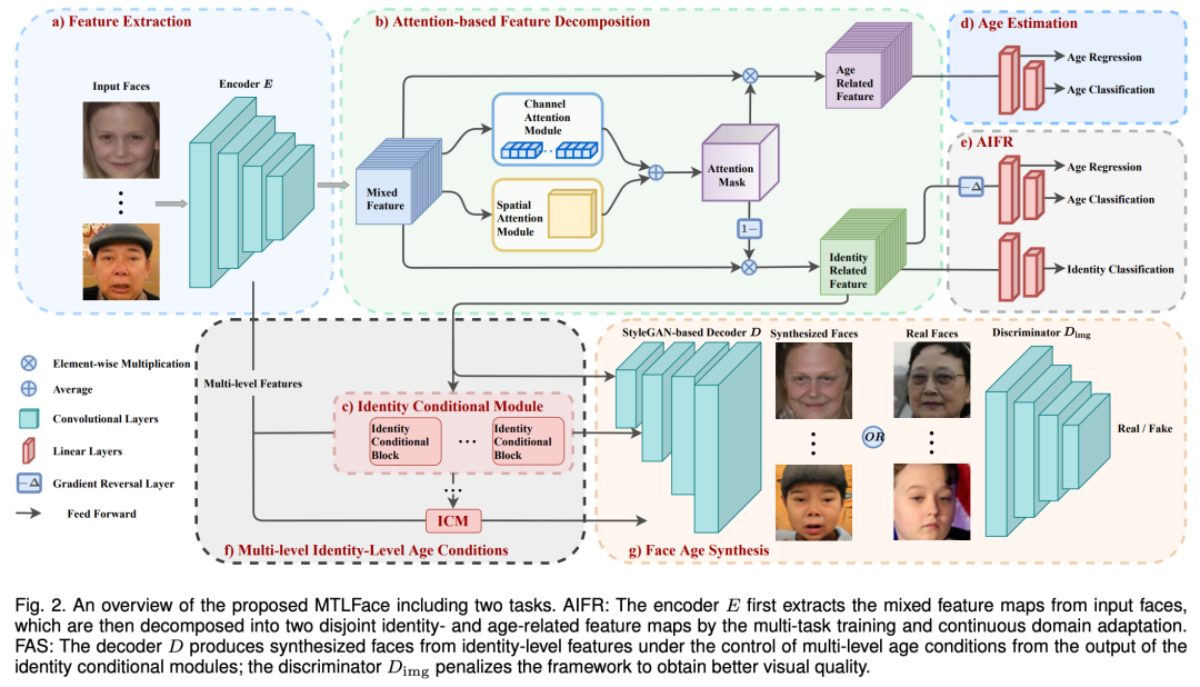 图3:多任务学习框架的示意图,展示了本文提出的多任务学习框架。对于 AIFR ,编码器 E 首先从输入人脸中提取混合特征图,然后通过多任务训练和连续域自适应将其分解为两个不相交的身份和年龄相关特征图。对于 FAS,解码器 D 根据身份条件模块的输出和多级年龄条件的控制下生成不同年龄的人脸,而鉴别器 Dimg 惩罚整个框架以获得更好的视觉质量。