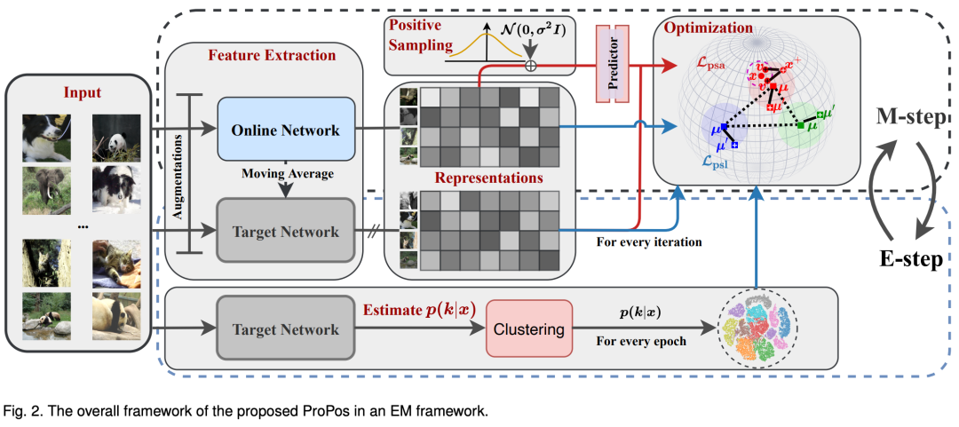 图4:整体框架,我们使用EM 框架来优化 ProPos,其中 E 步和 M 步详细如下: E-step: 对表征进行 k-means 聚类以得到伪标签;M-step: 优化本文提出的两个损失函数