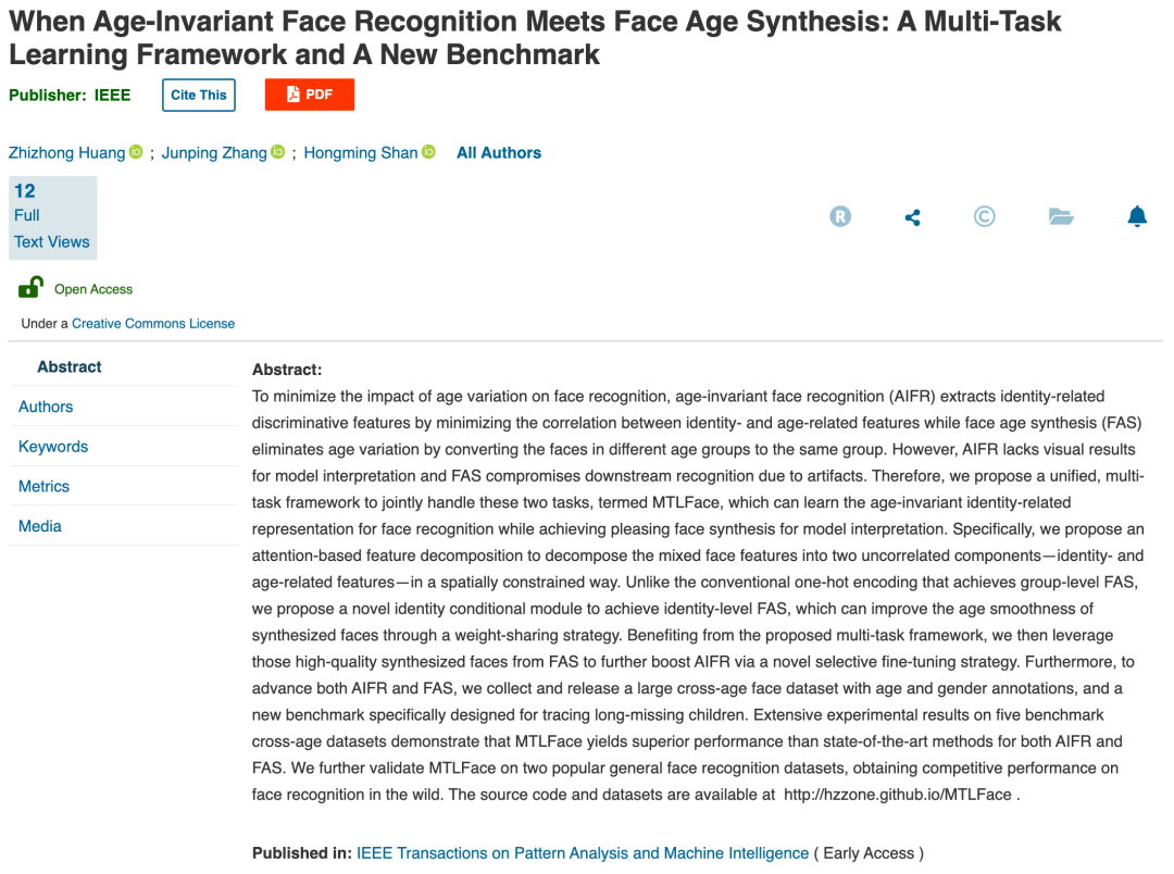 本文提出了一个统一的多任务框架来联合处理跨年龄人脸识别和合成两个任务,称为MTLFace。它可以学习用于人脸识别的年龄不变的身份表征,同时实现用于模型解释的令人满意的人脸合成。具体而言,我们提出了一种基于注意力的特征分解,以空间约束的方式将混合的面部特征分解为两个不相关的分量身份特征和年龄相关特征。与实现组级合成的传统one-hot编码不同,我们提出了一种新的身份条件模块来实现身份级的合成,该模块可以通过权重共享策略提高合成人脸的年龄平滑度。受益于所提出的多任务框架,我们利用年龄合成中的高质量合成人脸,通过一种新的选择性微调策略进一步提高人脸识别。此外,为了推进这两个任务,我们收集并发布了一个带有年龄和性别标注的跨年龄人脸数据集,以及一个专门为追踪长期失踪儿童而设计的新基准。在五个基准跨年龄数据集上的广泛实验结果表明,MTLFace在识别与合成中都比最先进的方法产生了更好的性能。我们在两个流行的通用人脸识别数据集上进一步验证了 MTLFace,在自然场景下人脸识别方面获得了竞争性的性能。